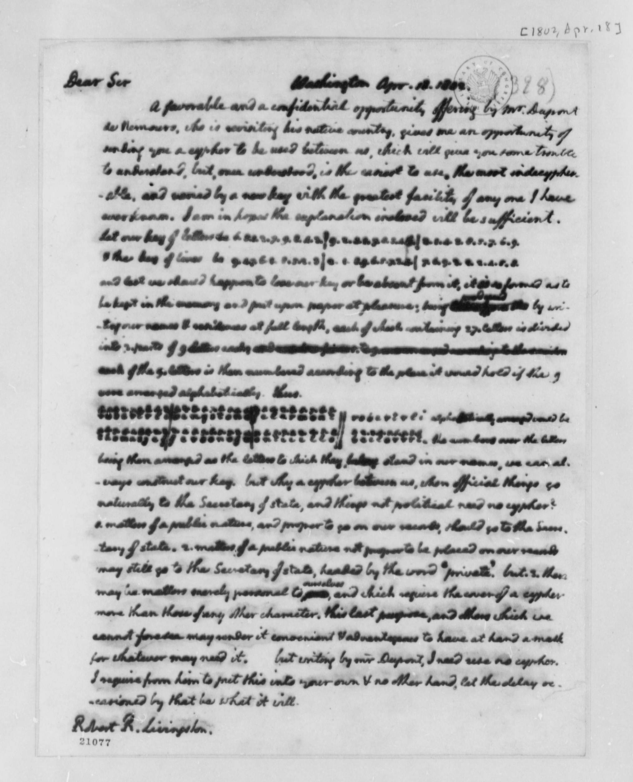 A decoded line of numerals in Robert Livingston's letter reveals France's original asking price for Louisiana. Livingston disguised sensitive parts of his letter to Secretary of State James Madison with a numerical code. (THNOC, 78-56-L)....